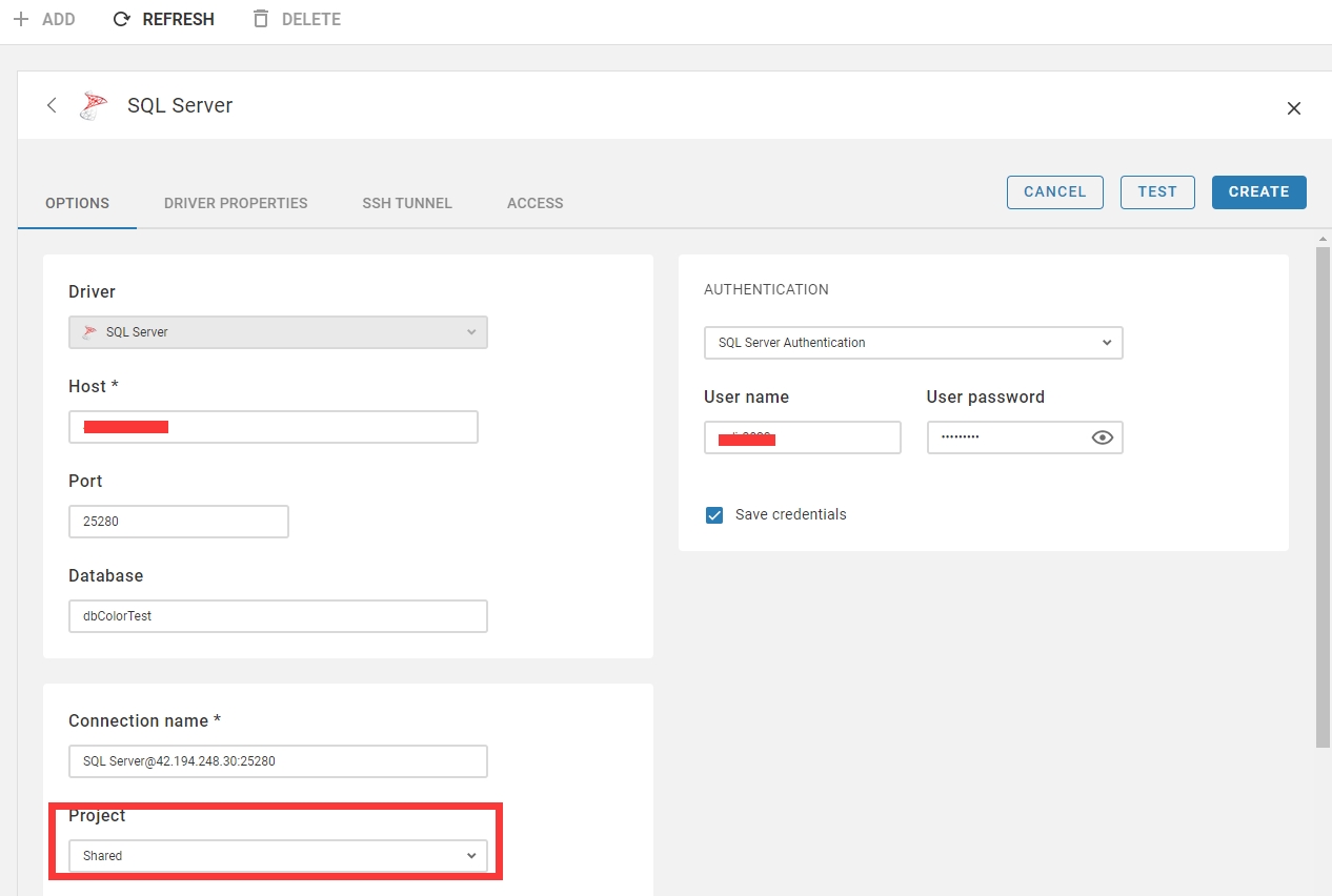 设置信息保存后,使用这个 SQLServer 连接,输入数据库的账号和密码