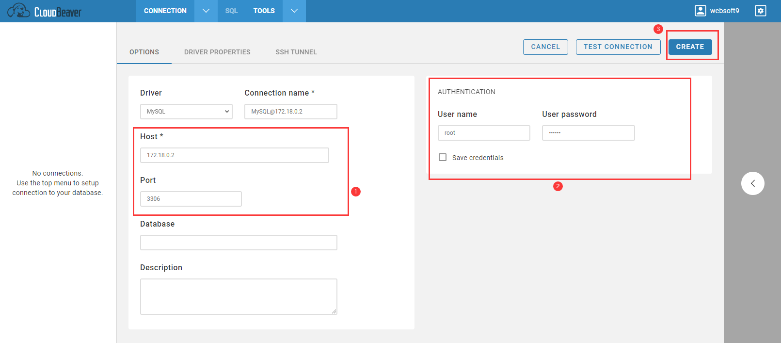 设置信息保存后,使用这个 MySQL 连接,输入数据库的账号和密码