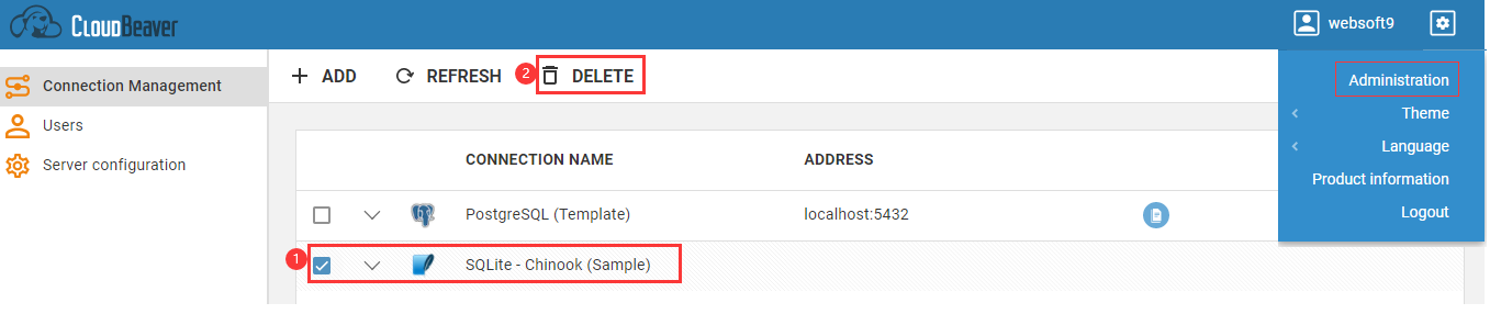 通过:【Administrator】>【Connection Management】,删除【SQLite - Chinook (Sample)】,避免遭受 SQL 注入攻击