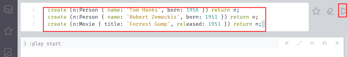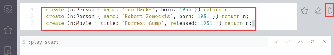 登录 Neo4j Browser,运行下面的命令录入三条节点数据