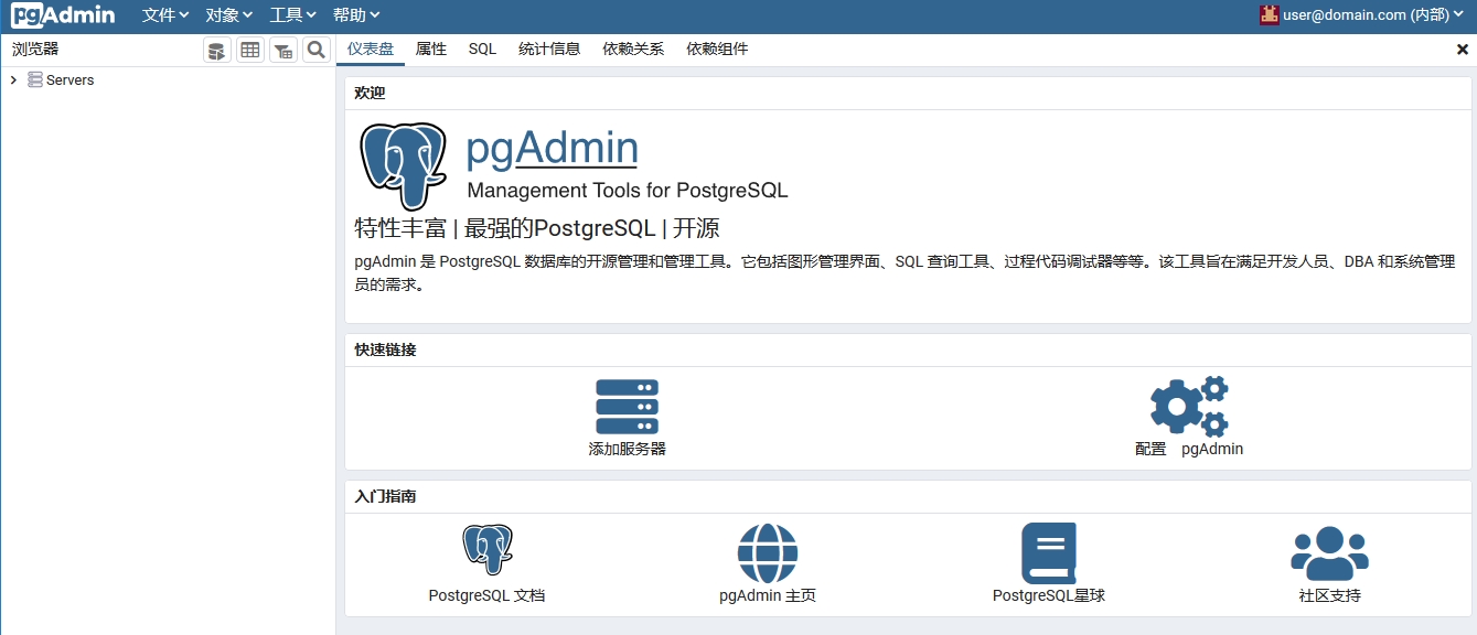 输入 pgAdmin 管理员的用户名和密码之后,进入控制台