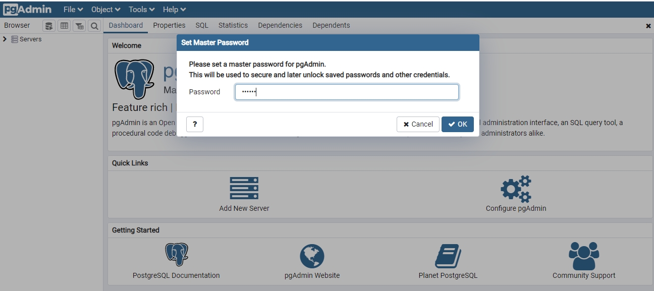 安装完成后,双击 pgAdmin 图标,会启动默认浏览器中打开 pgAdmin