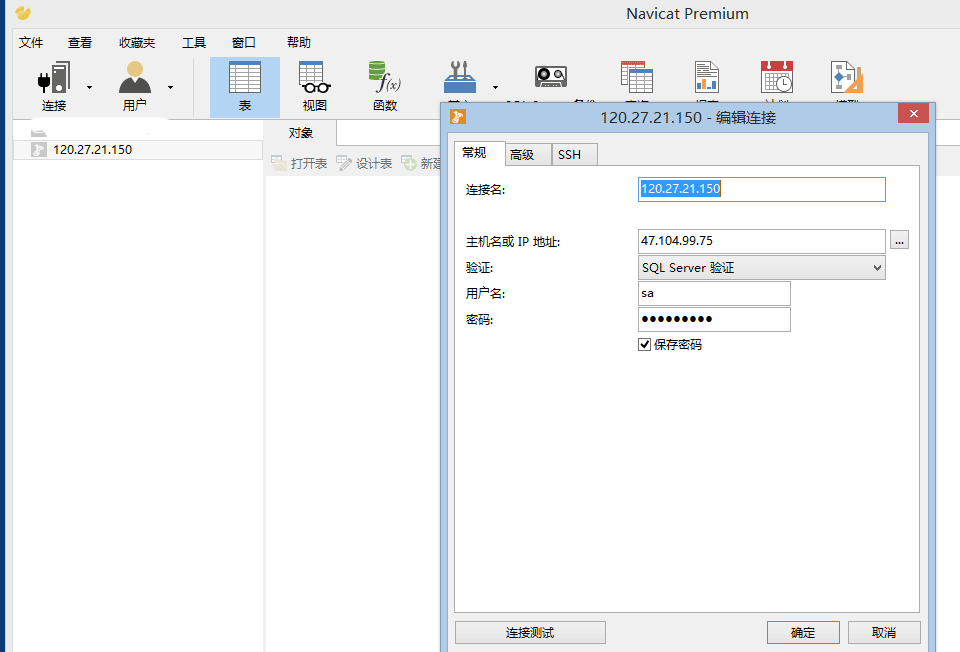 在Navicat->新建一个SQLServer连接,填写好连接参数
