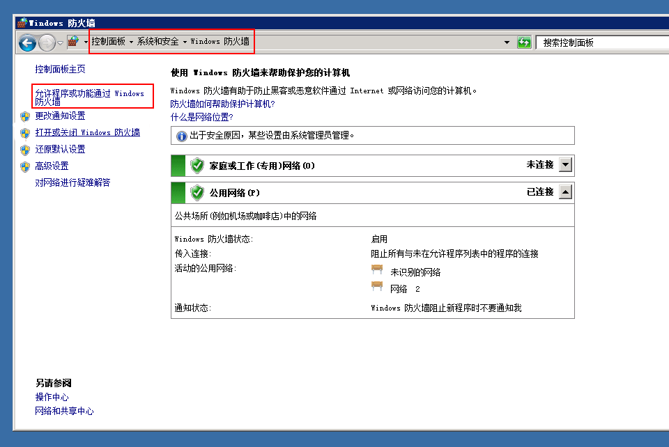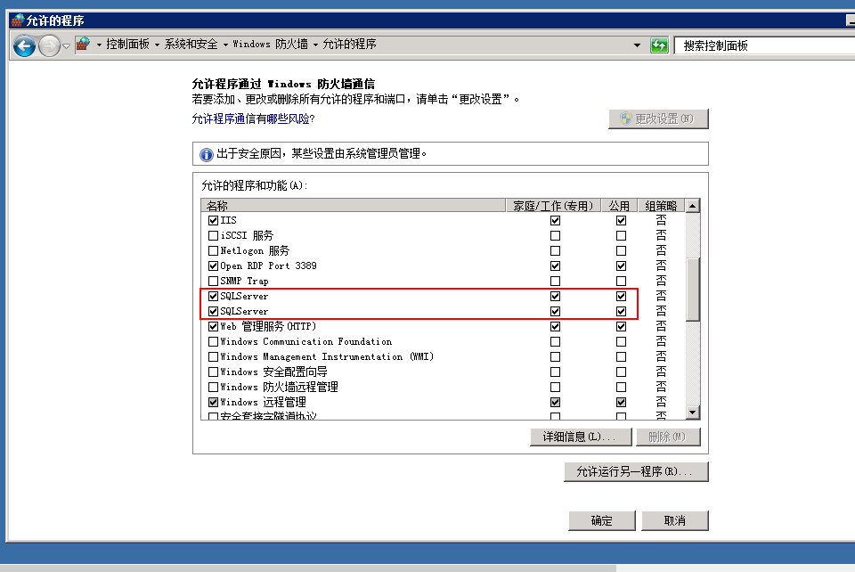在Windows服务器防火墙设置中开启远程访问:【控制面板】>【系统和安全】>【Windows防火墙】>【允许程序或功能通过Windows防火墙】
