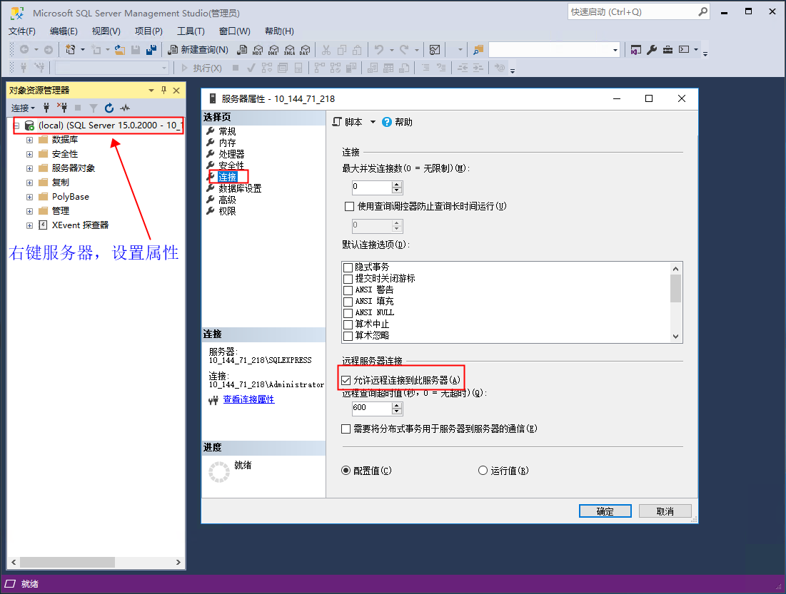 打开SQLServer企业管理器工具,在服务器【连接】属性中,勾选【允许远程连接到本服务器】