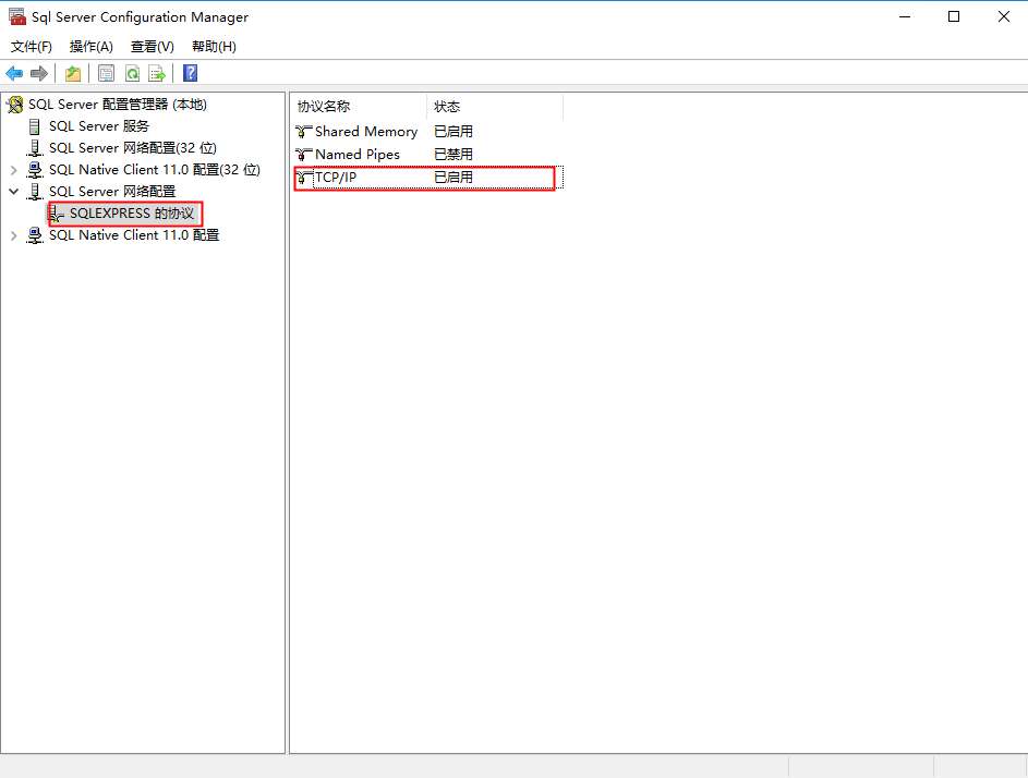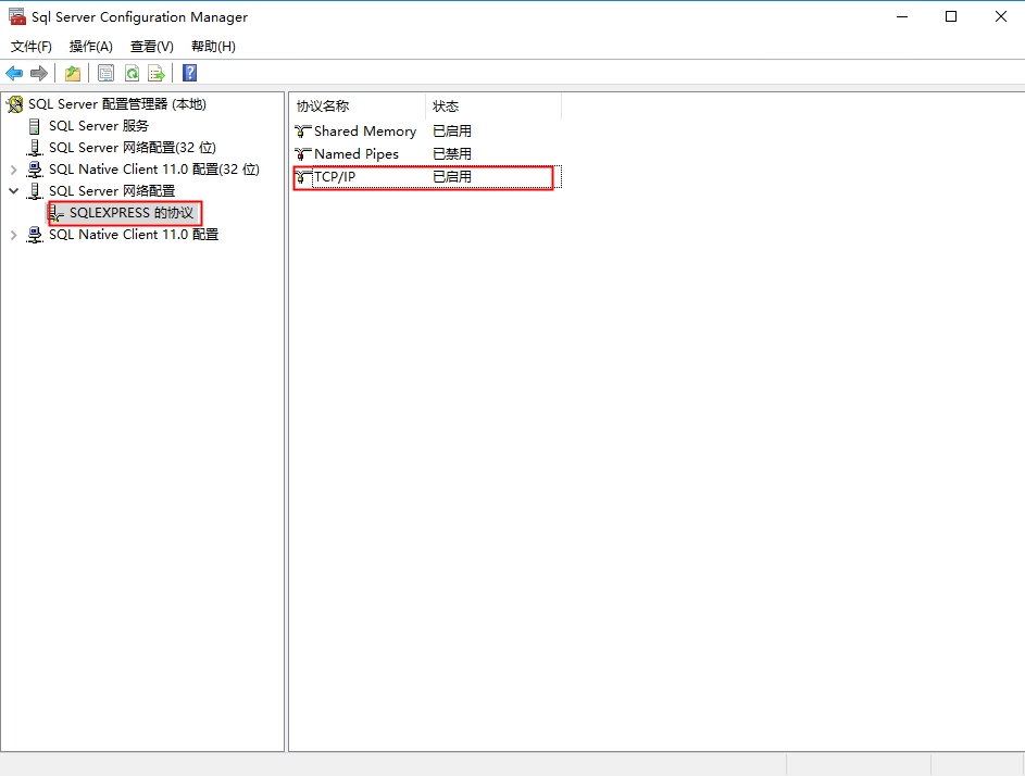 打开SQL Server 配置管理器工具,在网络配置中,启用【TCP/IP】协议