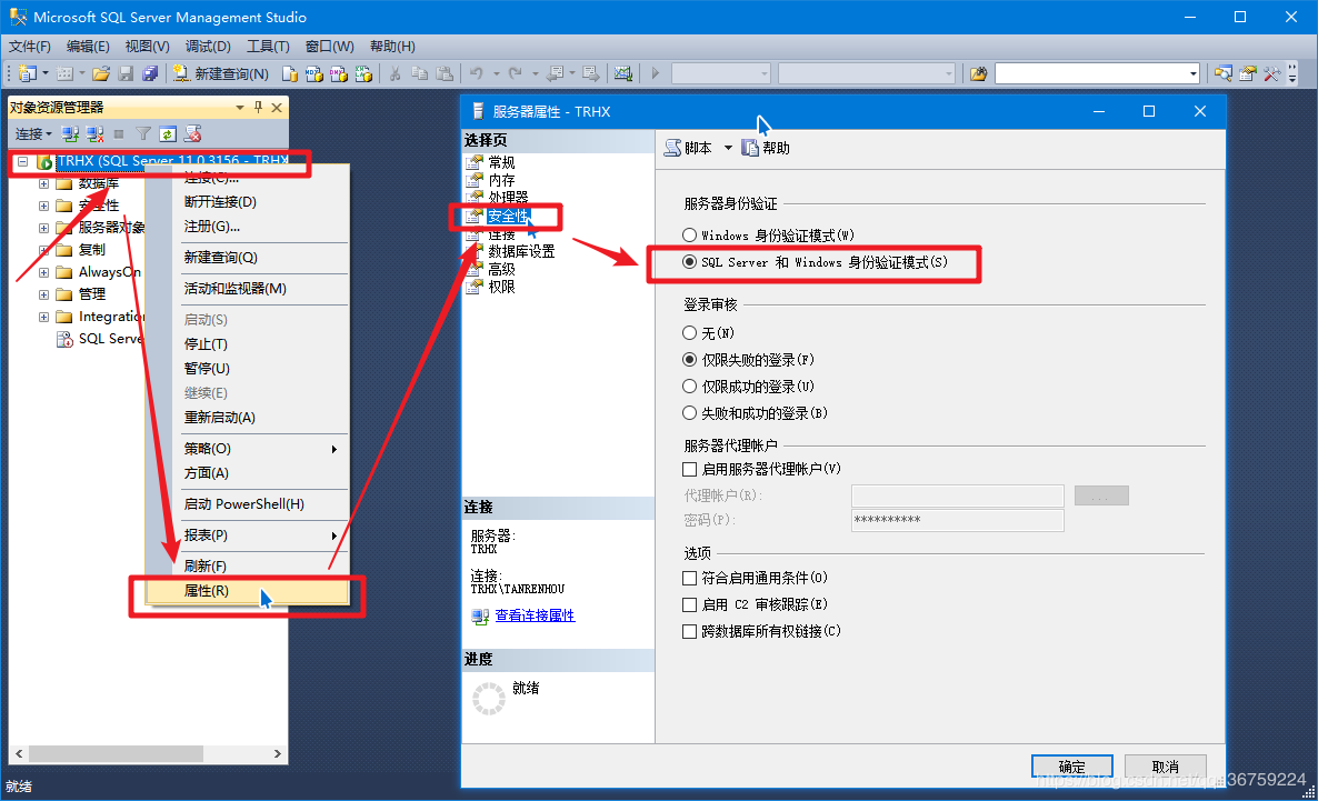 默认没有启用密码登录方式(SQL Server 身份验证模式),参考下面的步骤设置: