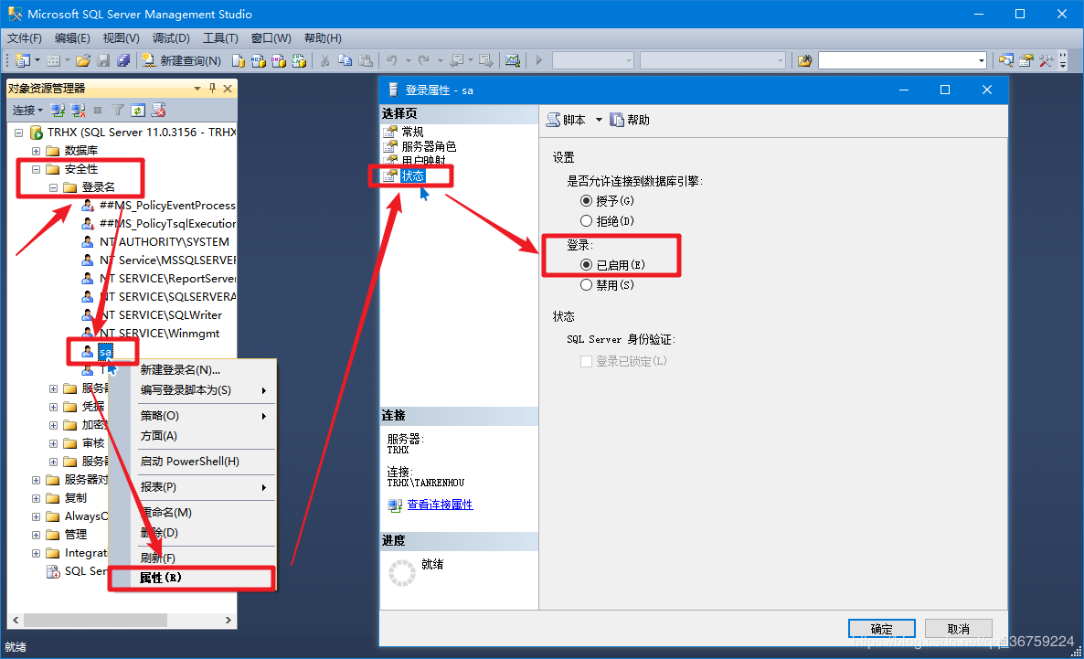 启用 sa 账户,并设置密码:依次展开【安全性】、【登录名】,找到默认登录名【sa】,右键【属性】,在弹出的窗口中点击【状态】,将登录选项选择【已启用】,也可以在【常规】选项卡里设置你的登录密码,点击确认保存.