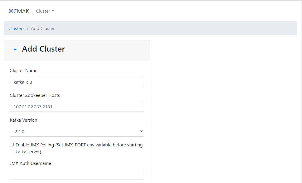 http://服务器公网IP:9091,进入 CMAK 登录页面成功登录后,开始新建集群