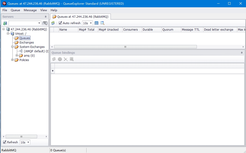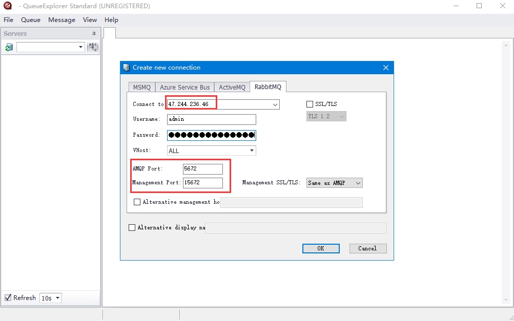 用户可以通过本地的 MQ 工具连接 RabbitMQ 服务器。下面以 QueueExplorer 这款客户端工具为例进行说明: