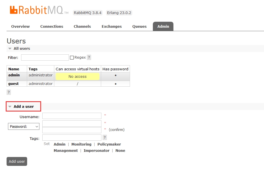 登录 RabbitMQ 后台,依次打开:【Admin】>【Add a user】