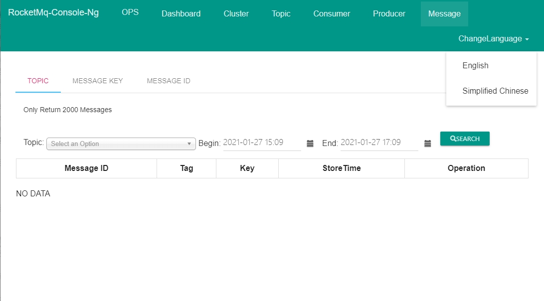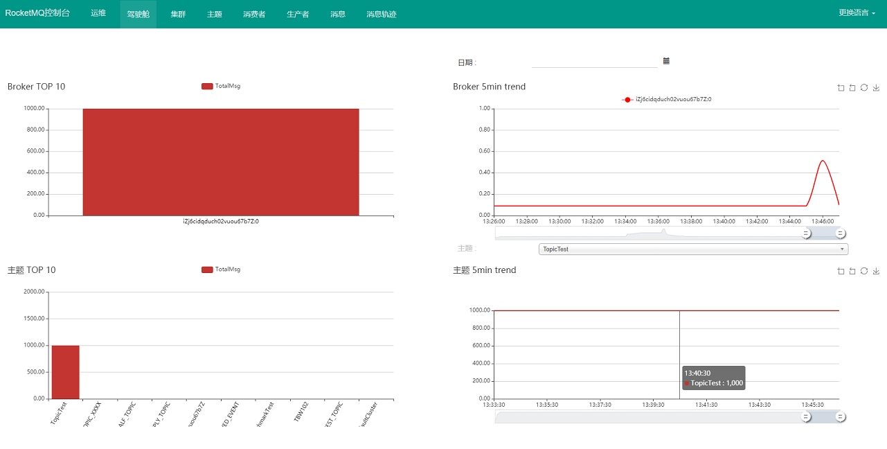 RocketMQ-Console 语言设置 接下来便可以在可视化界面查看驾驶舱、集群、消费者等信息(参考官网文档)