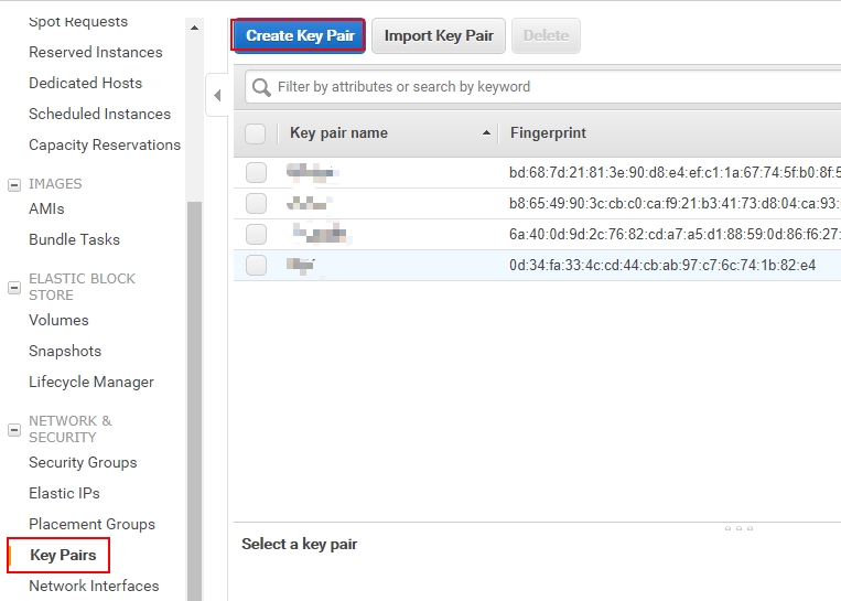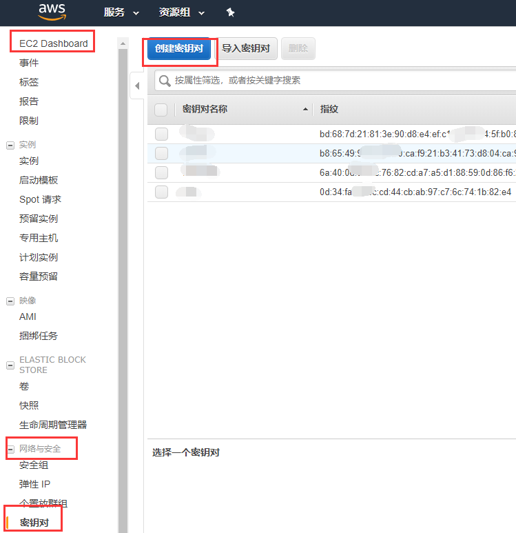 登录AWS控制台,打开:EC2 Dashboard->网络与安全->秘钥对,点击“创建秘钥对”按钮