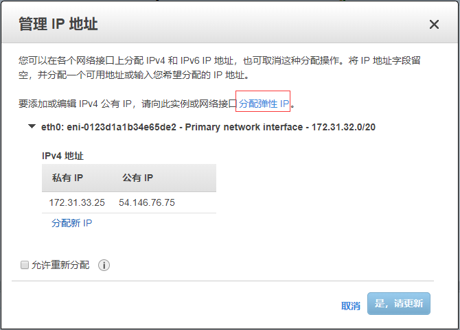 打开所需的实例,查看:操作->联网->管理IP地址