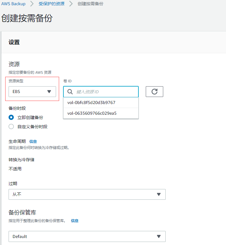 资源类型为:EBS(磁盘),再选择一个列出的卷ID
