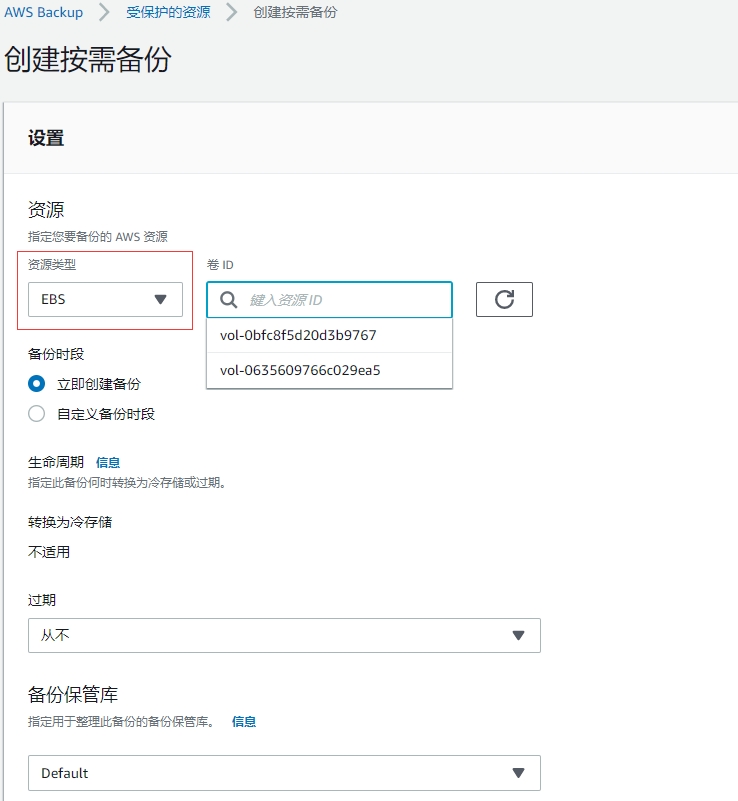 在已有备份计划下,创建按需备份(即选择需要备份的云资源)
