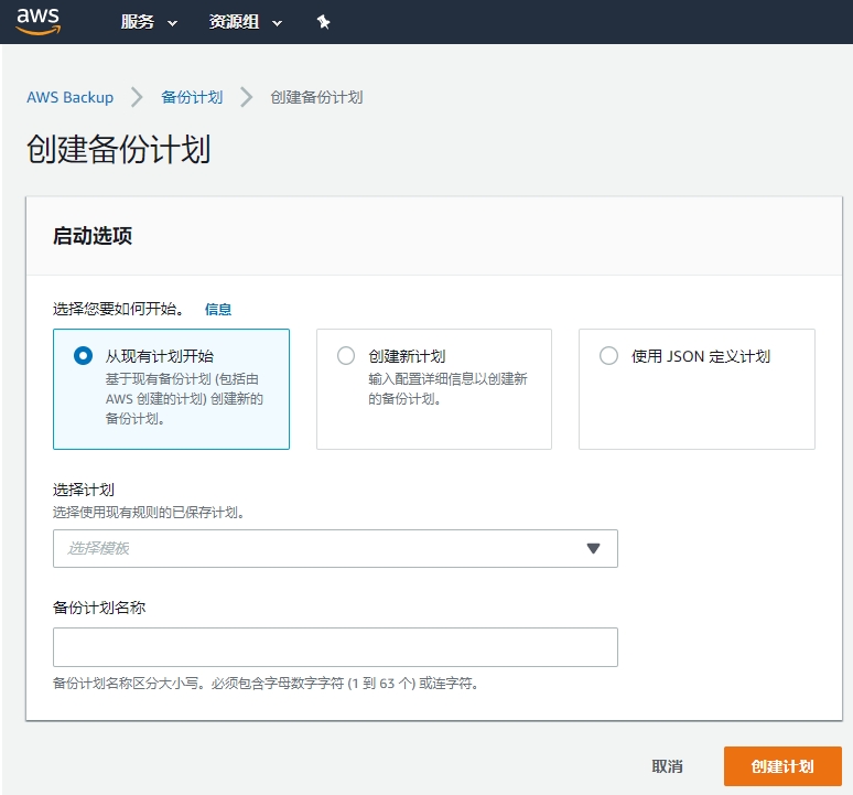 登录AWS控制台,打开:服务->存储->AWS Backup,创建一个备份计划