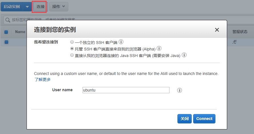 登录AWS云控制台,打开:实例->连接,选择第二种连接方式后,点击“Connect”按钮