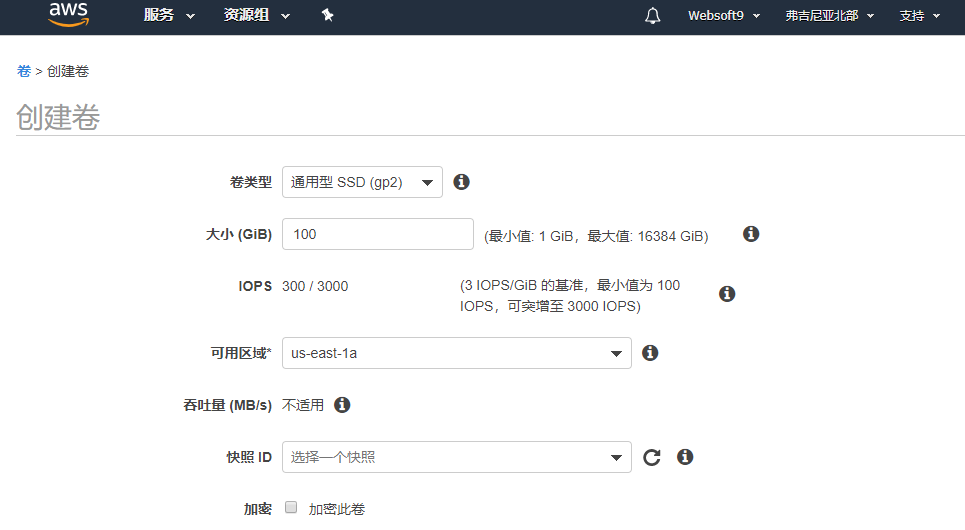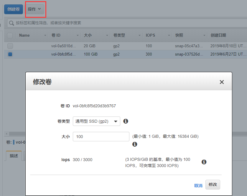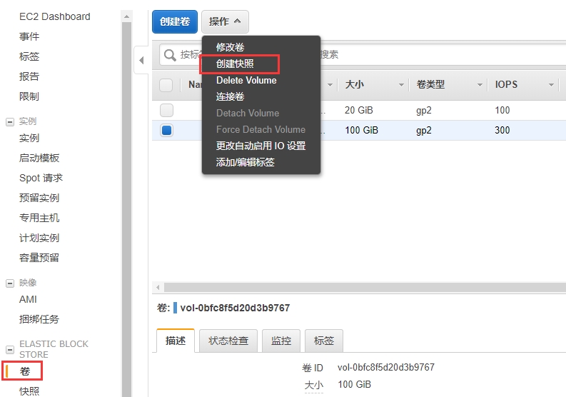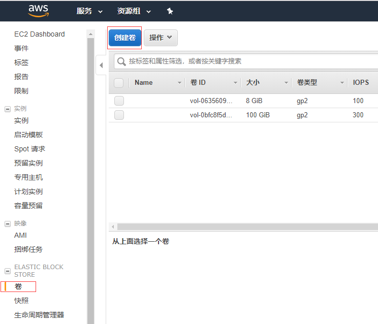 登录AWS控制台,依次打开:EC2->ELASTIC BLOCK STORE->卷