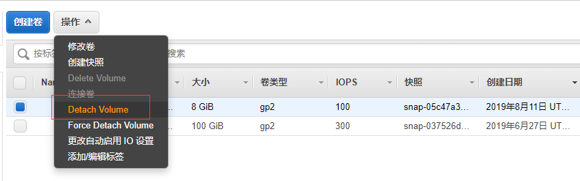 将卷从EC2中解除绑定关系,操作如下