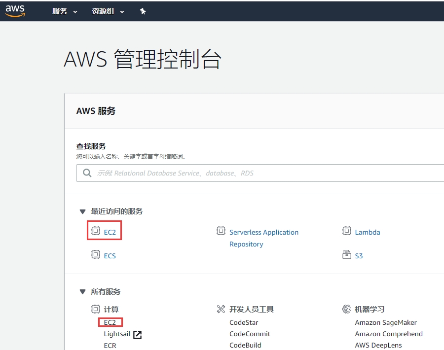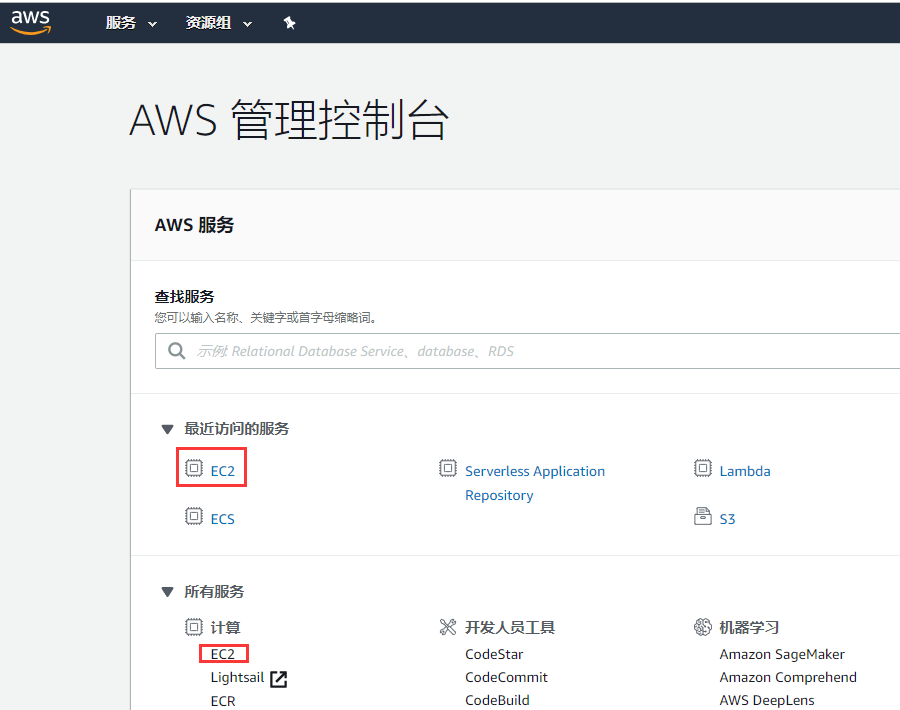 登录到AWS管理控制台,点击“EC2”,
