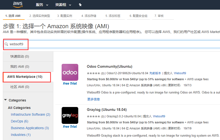 选择一个你所需的镜像(以Odoo为例),开始创建EC2实例