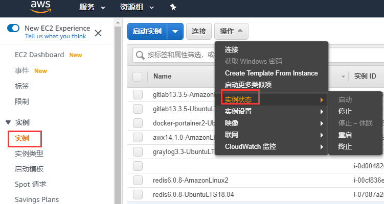 在EC2控制台可以对实例状态进行修改,包括: