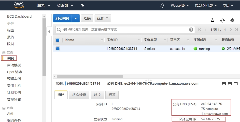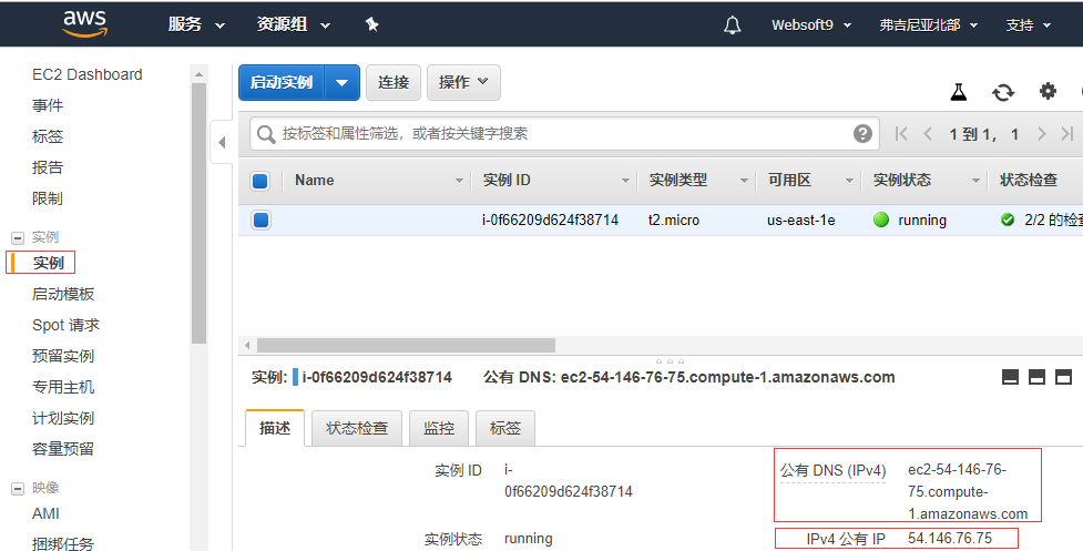 打开要查看公网IP的实例,我们会看到 公有IP 和 公有DNS