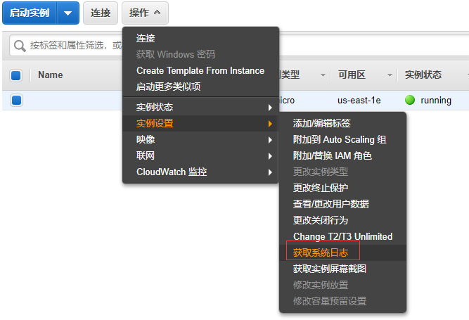 EC2控制台可以方便的获取系统日志:
