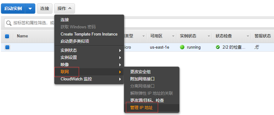 当创建的实例没有公网IP地址,只要有空闲(或新购)的公网IP地址,AWS控制台是可以给实例挂载上公网IP地址的。具体操作步骤如下: