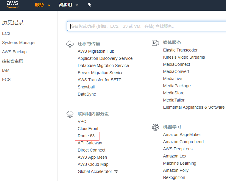 在AWS门户,在联网与内容分发类别找到Route 53服务