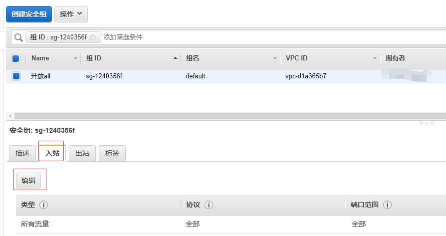 进入所属安全组的设置后,打开“入站”标签页,点击编辑