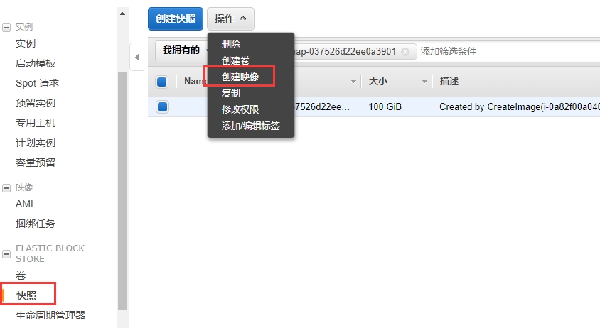 打开ELASTIC BLOCK STORE下的卷功能,选择一个卷后,实现“创建”快照操作