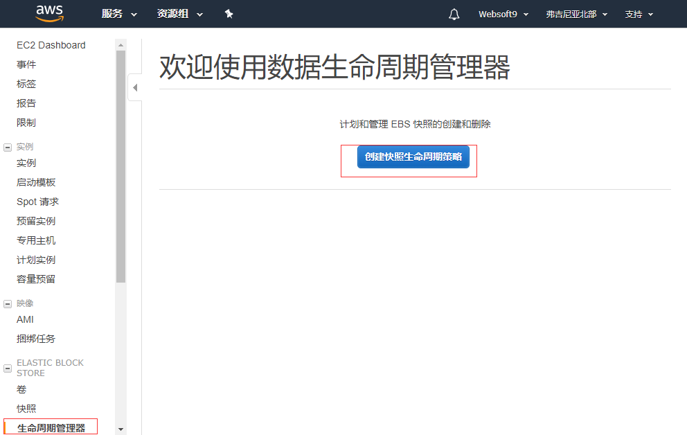 打开:EC2->ELASTIC BLOCK STORE->生命周期管理器,创建快照生命周期策略