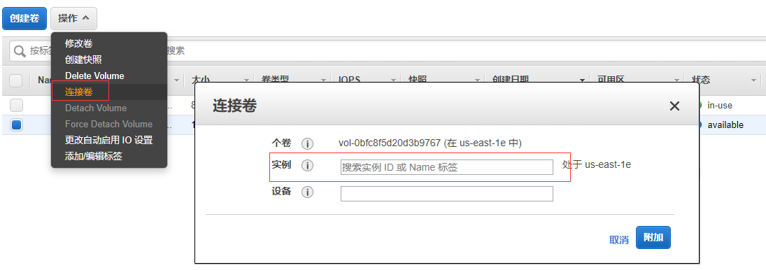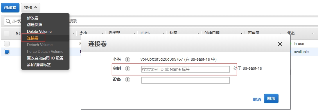 将创建好的卷,挂载到EC2实例
